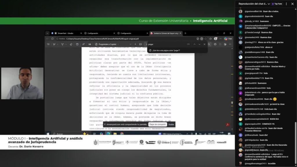 El pasado sábado 11 de abril, se transmitió la primera clase del Curso de Extensión Universitaria sobre Inteligencia Artificial, organizado por la Facultad de Derecho y Ciencias Sociales y Políticas de la Universidad Nacional del Nordeste junto a la Fundación Formarte. El video de esta clase acumuló 3.5K visualizaciones desde su transmisión hace 2 días, cosechando más de 5 mil inscriptos de la región y del extranjero.
