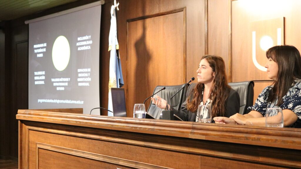 La coordinadora Lic. Lorena Berardi, presentó el Gabinete Pedagógico y de Orientación, que ofrece programas de tutorías para acompañar a las y los estudiantes en su integración a la vida universitaria. Explicó que las tutorías, a cargo de estudiantes avanzados o graduados, buscan “fortalecer competencias académicas como la oralidad, redacción y comprensión lectora”, brindando herramientas para que los estudiantes puedan seguir su trayectoria de forma autónoma. Además, mencionó la existencia de talleres sobre regulación emocional, procrastinación académica y ansiedad académica, así como talleres de estrategias y métodos de estudio. También destacó la presencia de servicios como los espacios de escucha y orientación individual, y la inclusión y accesibilidad académica para estudiantes con discapacidad.