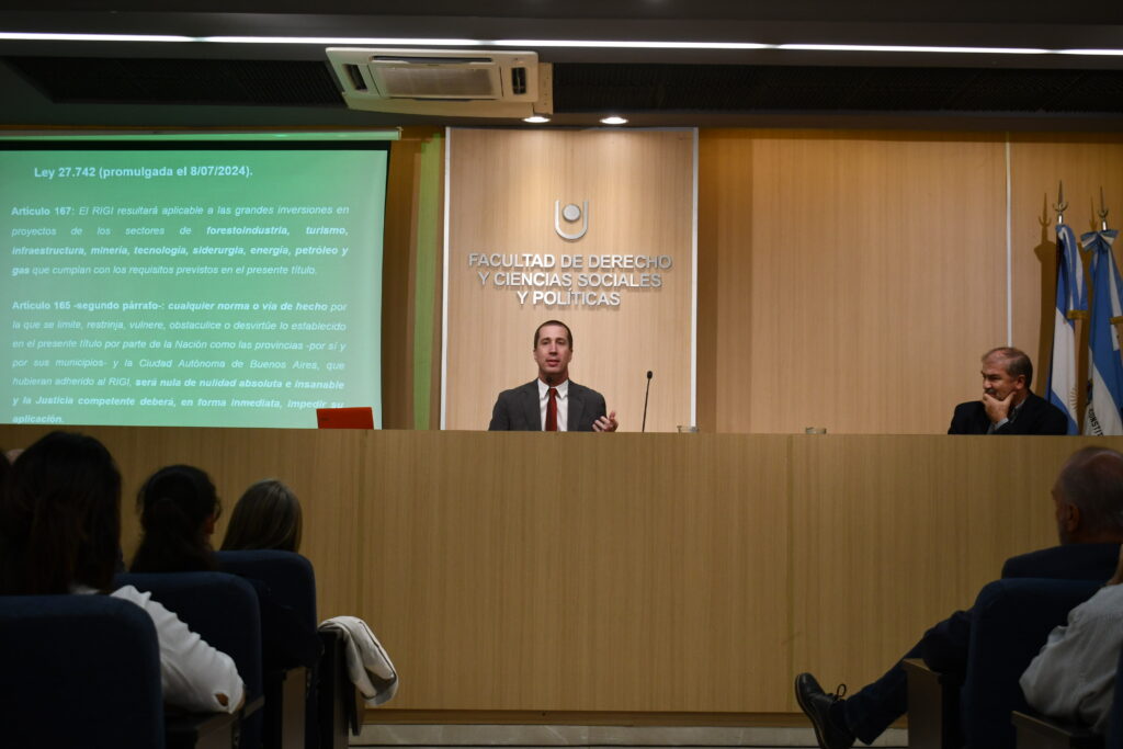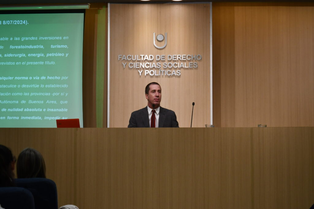 Uno de los momentos más destacados de la jornada fue la disertación del Dr. Pablo R. Lorenzetti, Juez de la Cámara de Apelaciones de Santa Fe. Lorenzetti alertó sobre la problemática de los retrocesos en la protección de derechos fundamentales. En particular, calificó como «regresiva y peligrosa» la Ley Bases en Argentina, señalando que el Régimen de Grandes Inversiones podría anular normativas ambientales vigentes.